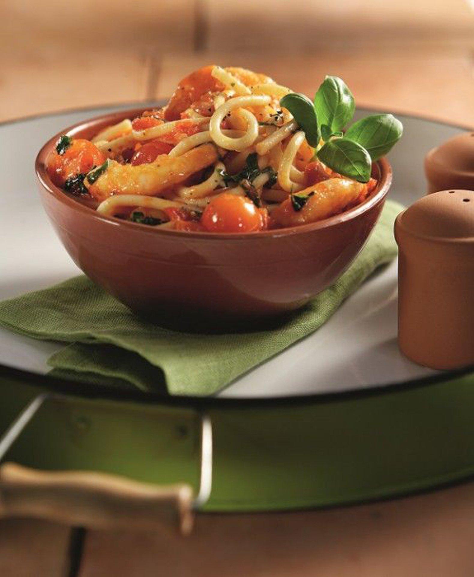 Εμείς τα ξέρουμε ως μακαρόνια παστίτσιου, οι Ιταλοί πάλι ονομάζουν αυτό το ζυμαρικό τους bucatini. Όπως και να τα πείτε το σίγουρο είναι ότι δημιουργούν πολύ νόστιμα πιάτα και ταιριάζουν υπέροχα με κόκκινες σάλτσες. Εδώ τα ντοματίνια παντρέυονται με τις γαρίδες, ενώ ο βασιλικός δίνει επιπλέον αρώματα στο πιάτο.